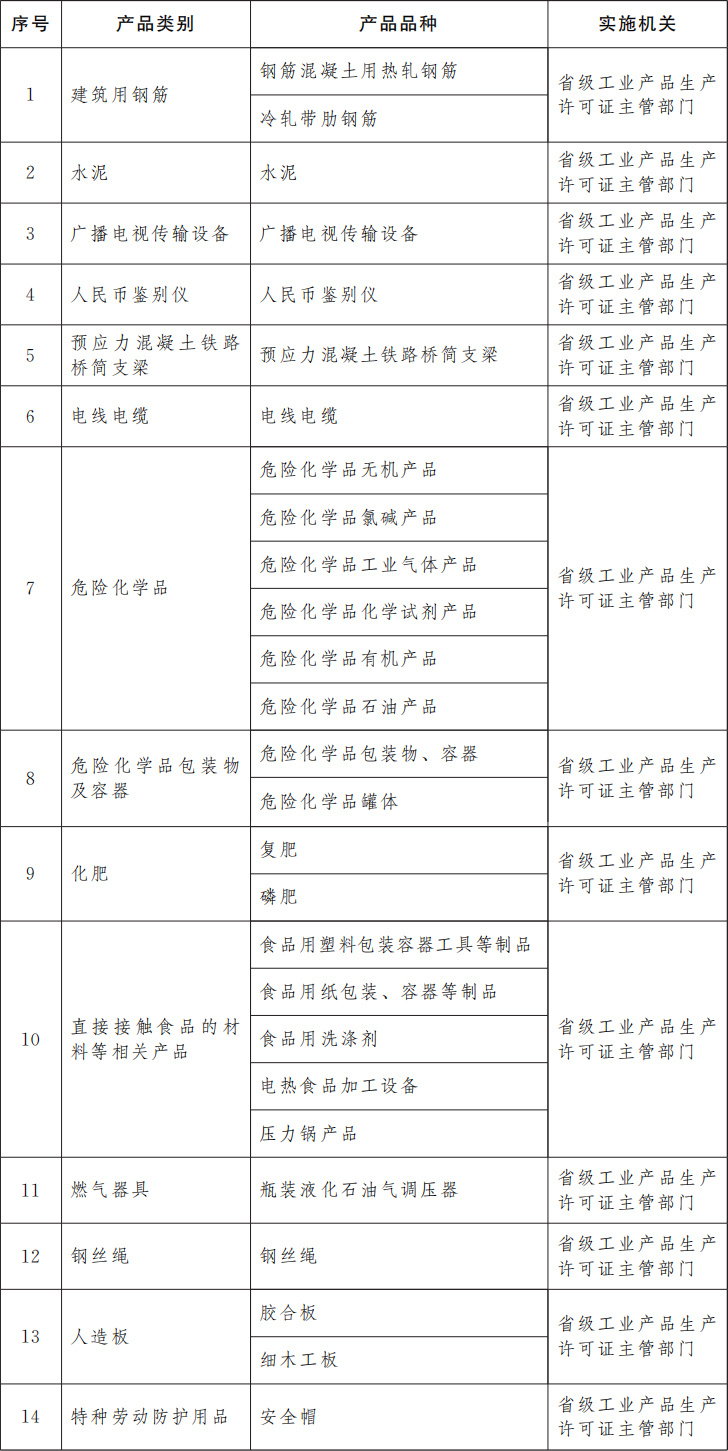 為保障重要工業(yè)產(chǎn)品質(zhì)量安全,強(qiáng)化產(chǎn)品準(zhǔn)入管理和源頭治理,防范產(chǎn)品質(zhì)量安全重大風(fēng)險(xiǎn),確保人民群眾生命財(cái)產(chǎn)安全和公共安全,國(guó)務(wù)院決定,調(diào)整完善工業(yè)產(chǎn)品生產(chǎn)許可證管理目錄,對(duì)冷軋帶肋鋼筋、瓶裝液化石油氣調(diào)壓器、鋼絲繩、膠合板、細(xì)木工板、安全帽等6種產(chǎn)品實(shí)施工業(yè)產(chǎn)品生產(chǎn)許可證管理。調(diào)整后,實(shí)施工業(yè)產(chǎn)品生產(chǎn)許可證管理的產(chǎn)品共計(jì)14類27個(gè)品種,由省級(jí)工業(yè)產(chǎn)品生產(chǎn)許可證主管部門負(fù)責(zé)實(shí)施,相關(guān)審批權(quán)限不得下放。同時(shí),化肥生產(chǎn)許可證審批方式由告知承諾調(diào)整為“先核后證”審批。