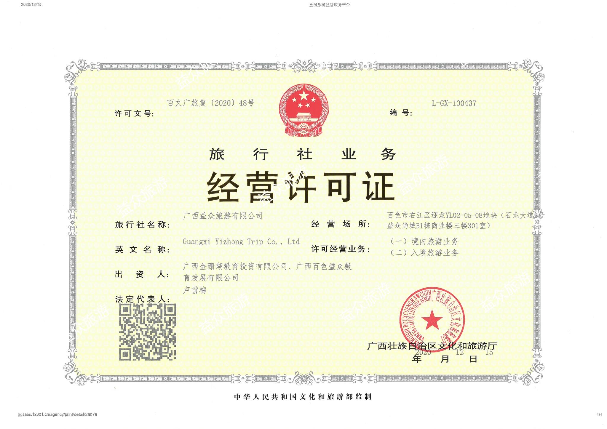????????12月15日,廣西益眾旅游有限公司通過廣西壯族自治區(qū)文化和旅游廳各項認證,符合國家各項標準要求,獲得了旅行社業(yè)務經營許可證。