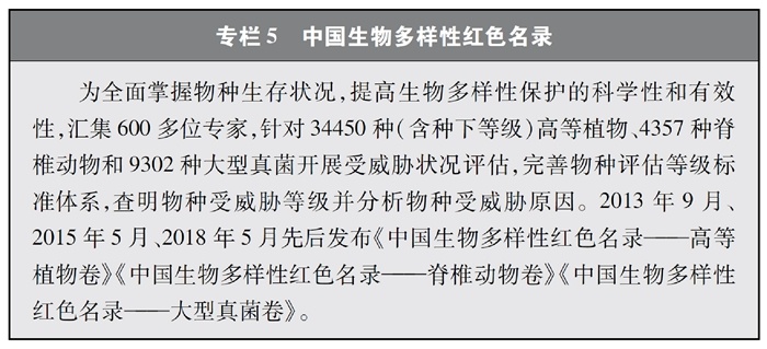 開展全國(guó)生物多樣性調(diào)查與評(píng)估。大力推進(jìn)生物多樣性保護(hù)重大工程實(shí)施,結(jié)合自然資源調(diào)查、生態(tài)系統(tǒng)監(jiān)測(cè)評(píng)估等工作,不斷完善生物多樣性調(diào)查與評(píng)估能力,首次將生物多樣性指標(biāo)納入生態(tài)質(zhì)量綜合評(píng)價(jià)指標(biāo)體系,引導(dǎo)地方加強(qiáng)生態(tài)文明建設(shè)與生物多樣性保護(hù)。開展自然資源調(diào)查,包括森林、草原、水、濕地、荒漠、海洋等,建立自然資源調(diào)查評(píng)價(jià)監(jiān)測(cè)制度。構(gòu)建了涵蓋2376個(gè)縣級(jí)行政單元、樣線總長(zhǎng)超過3.4萬(wàn)公里的物種分布數(shù)據(jù)庫(kù),建立物種資源調(diào)查及收集信息平臺(tái),準(zhǔn)確反映野生動(dòng)植物空間分布狀況。完成長(zhǎng)江經(jīng)濟(jì)帶、京津冀等國(guó)家戰(zhàn)略區(qū)域180多個(gè)縣級(jí)行政區(qū)生物多樣性調(diào)查與評(píng)估。組織開展近海漁業(yè)資源調(diào)查,初步掌握近海漁業(yè)資源狀況。陸續(xù)發(fā)布《中國(guó)植物紅皮書》《中國(guó)瀕危動(dòng)物紅皮書》《中國(guó)物種紅色名錄》《中國(guó)生物多樣性紅色名錄》,基本掌握生物多樣性總體情況,為加強(qiáng)生物多樣性保護(hù)奠定了科學(xué)基礎(chǔ)。