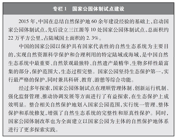 中國(guó)不斷推進(jìn)自然保護(hù)地建設(shè),啟動(dòng)國(guó)家公園體制試點(diǎn),構(gòu)建以國(guó)家公園為主體的自然保護(hù)地體系,率先在國(guó)際上提出和實(shí)施生態(tài)保護(hù)紅線制度,明確了生物多樣性保護(hù)優(yōu)先區(qū)域,保護(hù)了重要自然生態(tài)系統(tǒng)和生物資源,在維護(hù)重要物種棲息地方面發(fā)揮了積極作用。
