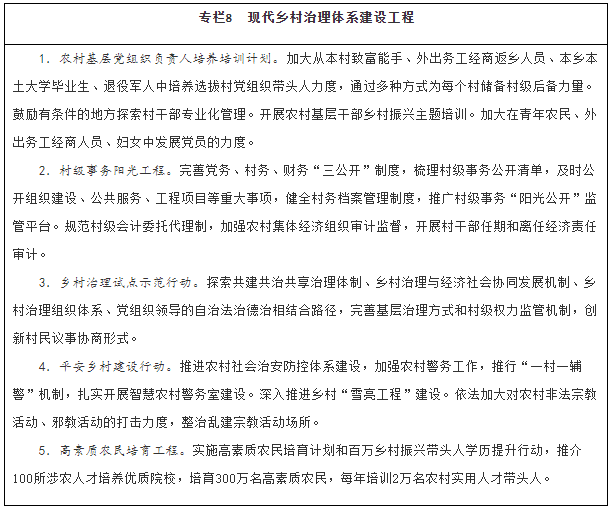 加強農村基層組織建設。建立健全以基層黨組織為領導、村民自治組織和村務監(jiān)督組織為基礎、集體經(jīng)濟組織和農民合作組織為紐帶、其他經(jīng)濟社會組織為補充的村級組織體系。選優(yōu)配強鄉(xiāng)鎮(zhèn)、村領導班子,持續(xù)向重點鄉(xiāng)村選派駐村第一書記和工作隊,發(fā)展農村年輕黨員。完善村民(代表)會議制度和村級民主協(xié)商、議事決策機制,拓展村民參與村級公共事務平臺。加強村務監(jiān)督委員會建設,強化基層紀檢監(jiān)察組織與村務監(jiān)督委員會的溝通協(xié)作、有效銜接,推行村級小微權力清單制度。推動鄉(xiāng)村服務性、公益性、互助性社會組織健康發(fā)展。加強村級組織運轉經(jīng)費保障。