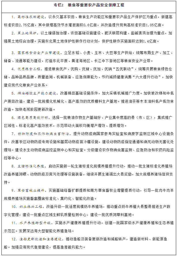 ——糧食等重要農產品供給有效保障。糧食綜合生產能力穩(wěn)步提升,產量保持在1.3萬億斤以上,確保谷物基本自給、口糧絕對安全。生豬產能鞏固提升,棉花、油料、糖料和水產品穩(wěn)定發(fā)展,其他重要農產品保持合理自給水平。